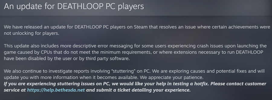The update also includes more descriptive error messaging for some users experiencing crash issues upon launching the game caused by CPUs that do not meet the minimum requirements, or where extensions necessary to run DEATHLOOP have been disabled by the user or by third-party software.