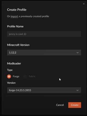 - Now, simply enter your desired profile name, select Minecraft version 1.12.2, then check Forge and click create.