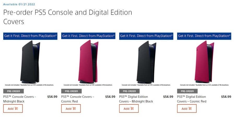 The Midnight Black and Cosmic Red PS5 console covers will become available starting in January 2022 at participating retailers in the following locations: USA, Canada, UK, France, Germany, Switzerland, Austria, Spain, Portugal, Italy, Australia, New Zealand, Japan, China, Taiwan, Hong Kong, Singapore, Malaysia, Thailand, Indonesia, Vietnam, Korea, and the Philippines.