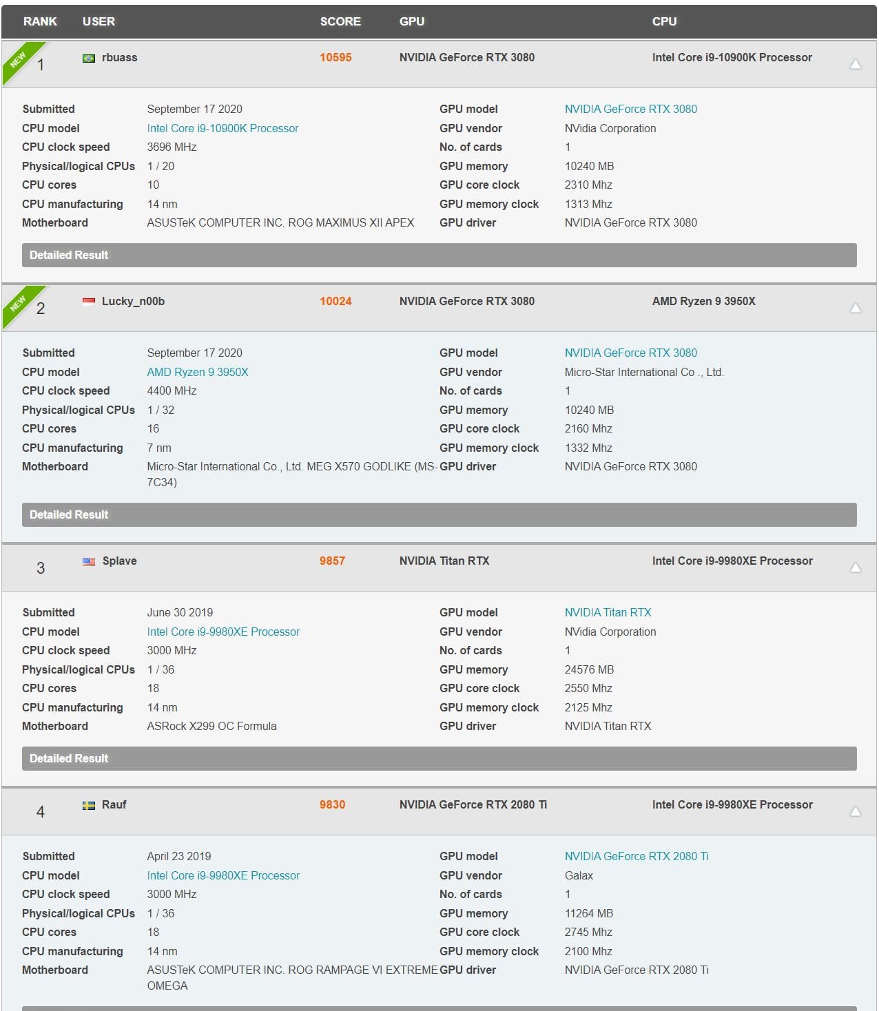 The first result of Time Spy Extreme Hall Of Fame settled with GALAX GeForce RTX 3080 SG, overclocked to 2310 MHz. With a score of 10,595 points, it topped the benchmark rating. This is about 7% more than the result of the GeForce RTX 2080 Ti, overclocked to 2745 MHz.