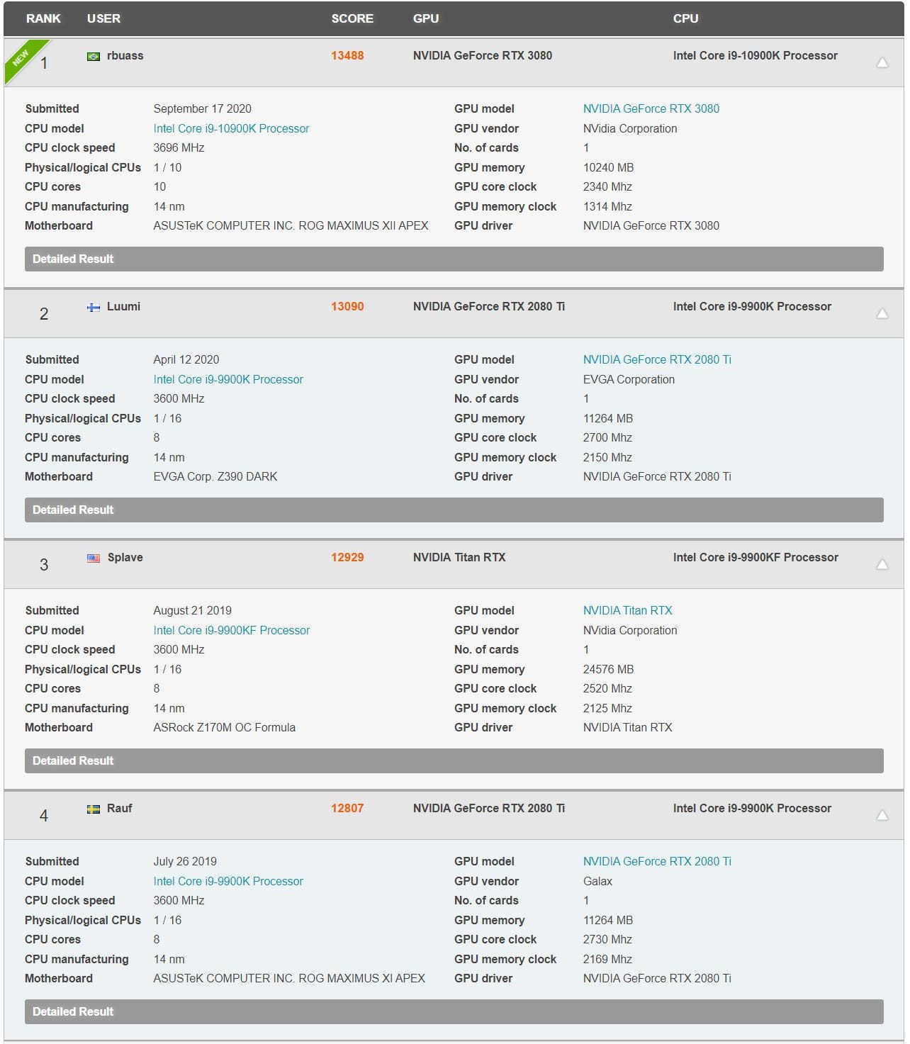 It should be noted that even though these results are record-breaking in themselves, they may soon dropdown. So far, the RTX 3080 SG has already been overclocked to 2340 MHz, besides, overclockers have not yet touched the memory, which promises even greater performance.