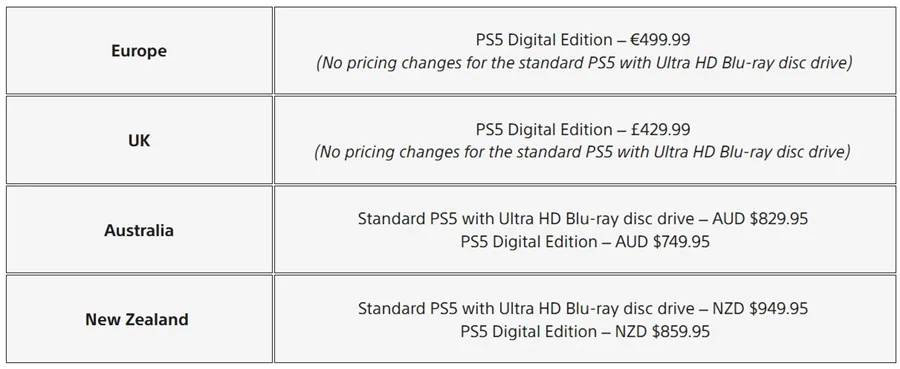 - United Kingdom: PS5 Digital Edition increases to £429.99 (up £40 from £389.99, a 10.25% increase); standard PS5 price unchanged.