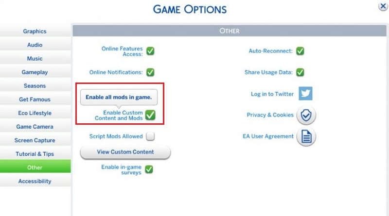 In order to use or activate custom content in the game, you will first need to manually enable any downloaded custom content and mods through the in-game menu. To do this, go to ‘Game Options’, then ‘Other’. From there, you can select ‘Enable custom content and mods’ and ‘Script mods Allowed’ to turn on your custom content.